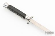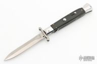 This Swing Guard Lockback Auto by AKC Italy has a polished stainless steel spear point blade with false top edge. The handle has black wood scales with stainless steel bolsters, liners, and stainless steel back spacer and lock.  Includes a zippered case. Excellent Condition.