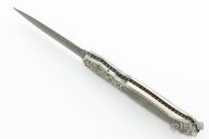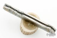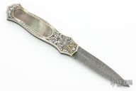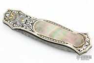 This Dagger Auto by Joe Kious features a Turkish Twist Damascus dagger blade with nail nick and false top edge. The handle has a stainless steel frame with black lip pearl inlays, fileworked Damascus backspacer. The handle has gold inlays and has been engraved by Julie Warenski, it is stunning. The face on the presentation side has ruby eyes, and the other side has sapphire eyes. Nice lockup and blade seating. Comes with velcro case. Has some light oxidation on the blade, has a few light scratches, has a chip in the pearl on the front scale, otherwise good condition. Attached is a picture of a letter about the knife from Joe Kious. If this knife is purchased, the consigner will mail the original copy to the buyer.