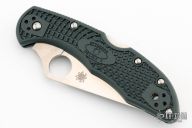 The blade on this Delica is ZDP-189, a powdered metal made by Hitachi that has phenomenal chemistry with 3% carbon. The hardness is around 64RC and edge retention is exceptional. The blade features spine jimping that extends from the ramp to the top of the handle. The Spyderco original thumb hole on the blade allows ambidextrous one-hand opening for right or left handers and the phosphor bronze washers at the pivot make the blade action smooth. The Delica has a lightweight FRN (fiberglass reinforced nylon) handle with skeletonized stainless steel liners and a strong back lock mechanism. The handle features screw construction for quick, simple cleaning and adjustment. The FRN scales utilize Spyderco's patented Bi-Directional Texturing to keep your hand from slipping under pressure. The pocket clip is 4-way reversible for tip-up/down and left/right carry.