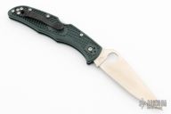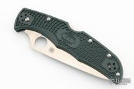 This Spyderco Endura knife has a British Racing Green FRN handle and a full-flat ground ZDP-189 stainless steel blade that is satin finished with a plain cutting edge.