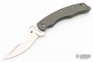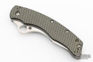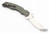 This C146CFP Szabo Folder from Spyderco features a satin finish clip point blade with swedge and thumb hole. The handle is comprised of gold line carbon fiber/G10 laminate scales over steel liners and barrel spacers. Black coated 4 way adjustable pocket clip. Lanyard tube in pommel. Excellent condition. Comes with original box and papers.