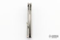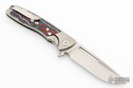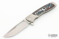 This Mini EVO Flipper from Brian Nadeau features a hand rub satin finished blade with a fullers, thumbhole, flipper and notched thumbrest. The handle is comprised of a bead blasted titanium frame with Nebula Fat Carbon inlays, satin titanium tip up clip. Rides on bearings, nice detent, lockup and blade seating, stainless lockface insert. Comes with original box. Excellent coniditon.