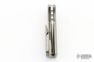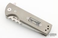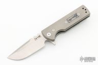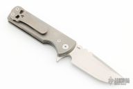 This Chaves T.A.K. features a satin finished drop point blade with the Chaves logo and a notched thumbrest. The handle has a tumble finished titanium scales over bead blast finish titanium liners and a matching reversible skull pocket clip. Laser engraved Chaves logo on the handle. Comes with original box and extra clip. Has a couple light scratches, otherwise excellent condition.