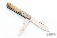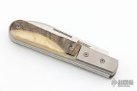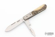 This Barlow by Lion Steel features a satin finished blade with nail nick, and a cap lifter with nail nick. The handle has bead blasted titanium bolsters and liners, ram's horn covers, satin finished stainless steel springs. Has half-stop, flush in all positions. Excellent condition.
