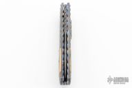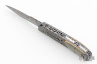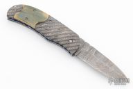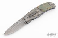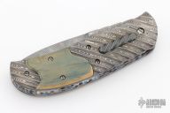 This is a very unusual early Hinderer auto. It features a Damascus blade with fileworked spine. The handle has Rick Hinderer fluted Damascus bolsters and butt, nice mammoth ivory scales, fileworked and anodized titanium liners and fileworked stainless steel backspacer, has fileworked screws. Pearl insets in the spine. Has a fluted Damascus button on the bolster that releases the blade. Nice lockup and blade seating. Perfect function. Has "R. HINDERER" inside backspacer. Excellent condition.