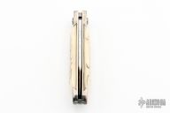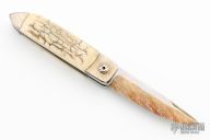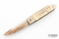 This Bolster Release Auto by Larry B. Gordon features an Eggerling Damascus blade. The handle is comprised of matching dovetailed Damascus bolsters, mammoth scales, and Maltese Cross fileworked backspacer. Knife can be opened and closed from either side, pushing down on the top of the scale to release the blade. Has some light scuffs and scratches. Great condition otherwise.
