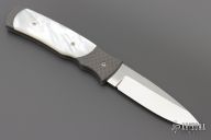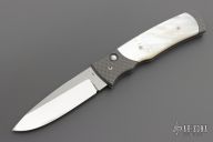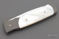 This Automatic by Z Custom Knives features a mirror polished drop point blade with file worked thumbrest. The handle is comprised of a bead blasted titanium frame with pearl inlays and inlaid push button over a fileworked stainless steel backspacer. Has some light scuffs and scratches, excellent condition. Hard to find!