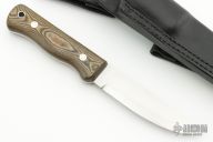 This Scandi Bushcraft Knife by Dave Beck features a hand rub satin finished blade with a scandi grind, .122" blade stock and 1.085" blade depth, full tang construction. The handle has richlite scales with orange liners. Comes with a black leather sheath. New from maker.