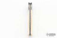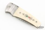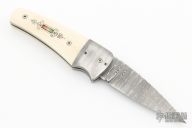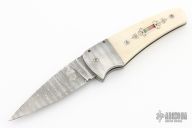 This Auto by Doc Hagen features a Damascus drop point blade with fileworked spine. The handle has dovetailed Damascus bolsters, scrimshaw bone scales, polished titanium liners, fileworked Damascus backspacer, fileworked screws. Nice lockup, action and blade seating. #891. Excellent condition.