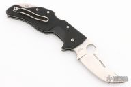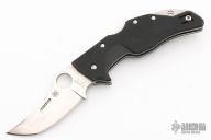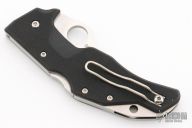 The Battlestation is an extremely stout folding knife built on a framework of solid stainless steel handle liners. They are capped by textured G-10 scales that feature meticulously machined relief cuts for easy access to the blade’s Trademark Round Hole™ when opening the knife.  The blade of the Battlestation is a unique hybrid profile that features a slightly curved, Americanized tanto-style point and a strong saber-ground PlainEdge™ cutting edge. Ground from VG-10 stainless steel, it also features twin fullers (grooves) in the blade flats and a beveled swedge at the tip to ensure a strong but capable point. An index-finger choil at the heel of the blade allows the user to choke up for extra control and features carefully machined jimping (textured grooves) for extra grip security. For swift, one-handed opening, the blade includes a 13mm Trademark Round Hole that also unmistakably identifies the Battlestation as a Spyderco design.  A reversible wire clip attached to the butt end of the handle supports left or right-side tip-up carry and complements all the other features of the knife to make its carry and operation completely ambidextrous.