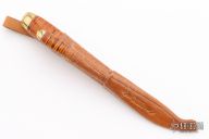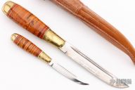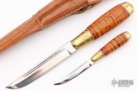 This Pukko Set by Iisakki Jarvenpaa features polished blades with fullers, brass fittings and stacked birch bark grip. Comes with a brown leather sheath that holds both knives. Has some light scratches, otherwise excellent condition.