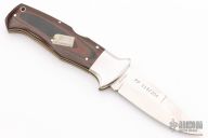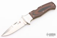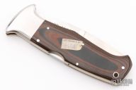 This SERE folder from Al Mar Knives features a satin finish drop point blade with false top edge and nail nick. Satin finish bolsters, brown/black paper micarta scales over brass liners. Opens and closes with a nice snap. Excellent condition. Pre Production #119 of 200