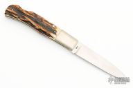 This BHL (Big Horn Lock) lockback folder by Jess Horn features a hand-rubbed satin finish blade with nail nick. The handle has satin nickel silver bolsters, stag scales, nickel silver liners, and a stainless steel spring. Opens and closes with a nice snap. Excellent fit and finish. #034 on the blade. Has a few light scratches, otherwise excellent condition.