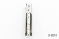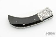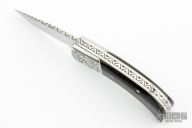 This Scale Release Auto by David Dill has a mirror polished drop point blade with filed spine. Scales are Buffalo horn with white liners, fileworked stainless steel liners, fileworked stainless steel back spacer, and engraved stainless steel dovetailed bolsters. Has nice action, lockup and blade seating. Has a couple light scuffs, excellent condition otherwise.