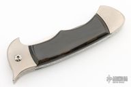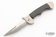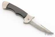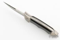 This Scale Release Auto by Larry B. Gordon features an Ealy Damascus blade. The handle is comprised of satin finished dovetailed titanium bolsters, front and rear, buffalo horn scales with stainless liners, and fileworked backspacer. Knife can be opened and closed from either side, pushing down on the top of the scale to release the blade. Has some light scuffs and scratches. Great condition otherwise.