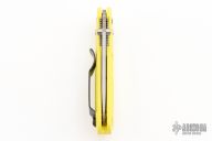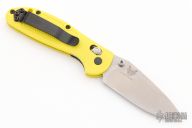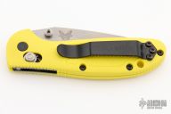 This axis-lock was designed by Mel Pardue and made by Benchmade stonewashed drop point blade a notched thumbrest and dual thumb studs. The handle is composed of yellow FRN and a black steel tip up pocket clip. Includes the original box and papers. Excellent Condition.