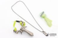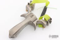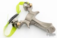 This slingshot by King Monkey is made from titanium and the handle has Damascus inlays. Fully adjustable. Comes with extra bands and green optic rubber strings. Has sights on both sides. Comes with zippered case and a dogtag and necklace. Has a few scuffs, otherwise excellent condition.