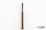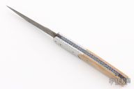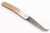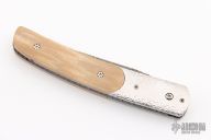 This Auto by Doc Hagen features a Hagen Damascus clip point blade with swedge and fileworked spine. The handle has stippled titanium bolsters, mammoth ivory scales, anodize finish and fileworked titanium liners, fileworked Damascus backspacer, fileworked screws. Nice lockup, action and blade seating. #1191. Has some light scratches, and the blade has colored over time, excellent condition otherwise.