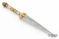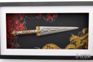 This Dragon Dagger by Vladimir Burkovski is #1. It features an antique finished and carved blade .111" blade stock and 1.483" blade depth, hidden tang construction. The handle is constructed of hand carved bronze and sterling silver. Comes with a COA dated 2-25-23. Comes with a framed shadow display box, but the glass broke and is no longer with the frame. Excellent condition otherwise.
