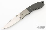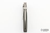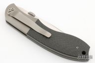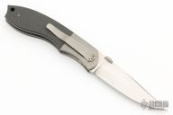 This Linerlock by Chris Smith features a hand rub satin finished blade with thumbdisc and notched thumbrest. The handle has bead blasted titanium bolsters, carbon fiber scales, bead blasted titanium liners, black linen micarta backspacer, and a tip down bead blasted titanium clip. Nice detent, lockup and blade seating. Comes with a nylon belt sheath. Has a couple light scuffs, otherwise excellent condition.