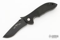This Emerson Commander has been converted to a D/A Scale Release Auto by Butch Vallotton. It has a black coated blade with thumb disk and notched thumbrest, wave feature. The handle has black G-10 scales, titanium liners, black G-10 backspacer, black stainless steel tip up clip, and lanyard hole. Comes with original box and papers. Excellent condition.