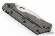 This Mick Strider SMF Fatty framelock folder features a two-tone nightmare ground blade with thumbhole and notched thumbrest. The handle has a black aluminum and flamed titanium frame with titanium clip, tip up carry. Jimping on blade spine. Nice lockup, detent, and blade seating. Has a few light scratches on the blade, otherwise excellent condition.