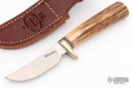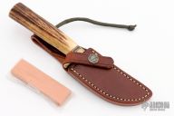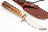 This Randall Made Model 21 has a satin finished upswept blade with notched thumbrest, .148" blade stock and a blade depth of .845", hidden tang construction. The handle has a nickel silver guard with a stag grip, red/white/blue spacers (6 spacers). Knife comes with a brown leather sheath. Has some oxidation on the tip of the blade, a couple light scratches, otherwise good condition.