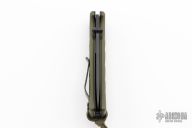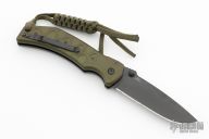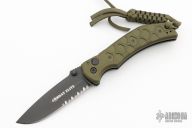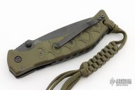This side opening automatic from Combat Elite features a partially serrated, black coated blade with swedge, dual thumbstuds and notched thumb ramp. The handle is comprised of green anodized and machined aluminum scales over black steel liners and notched backspacer. Lanyard hole with bead and lanyard on pommel. Black coated tip up clip. Crisp coil spring opening. Excellent condition.