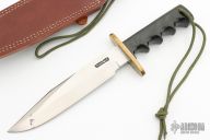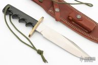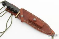 This Model 14 by Randall Made Knives features a satin finished blade with sharpened top edge, .228" blade stock. 1.363" blade depth, full tang construction. The handle has a brass guard, black linen micarta handle with a lanyard hole at the butt. This knife was designed to meet the demand for an almost indestructible all-purpose knife, though it is especially suited for combat and survival purposes. Comes with brown leather sheath. Has some oxidation on the blade, otherwise good condition.