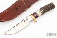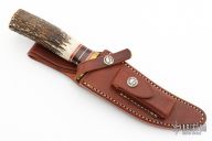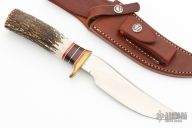 The Model 27 is an ideal all-around heavy-duty sportsman's knife. This knife has a satin finished blade with .205" blade stock and 1.299" blade depth, hidden tang construction. The handle has a brass guard and butt, thick stag grip with red/brass/white/red linen micarta/black/duralumin spacers. Comes with a brown leather sheath. Has a small oxidation spot on the tip, otherwise excellent condition.