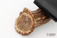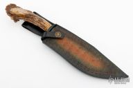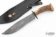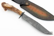 This Bowie by Adrian Guimarao (Abril Knives) features a beautiful random pattern Damascus clip point recurve blade, .20" blade stock and 2.25" blade depth, hidden tang construction. Darkened guard. Spectacular Patagonia crown stag grip. Comes with a hand tooled brown leather sheath. New from Maker!