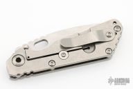 This Mick Strider Performance series SNG framelock folder features a satin finished drop point blade with thumbhole and notched thumbrest. The handle has a stonewashed titanium frame with titanium deep carry clip, tip up carry. Jimping on blade spine. Includes Hinderer "Lock Bar Stabilizer" for maximum reverse lock retention. Excellent lockup, detent, and blade seating. Includes a padded zippered case.  Excellent Condition.