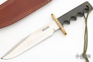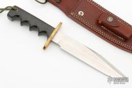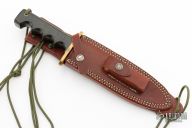 This Model 14 by Randall Made Knives features a satin finished blade with sharpened top edge, .199" blade stock. 1.384" blade depth, full tang construction. The handle has a brass guard, black linen micarta handle with a lanyard hole at the butt. This knife was designed to meet the demand for an almost indestructible all-purpose knife, though it is especially suited for combat and survival purposes. Comes with brown leather sheath. Excellent condition.