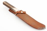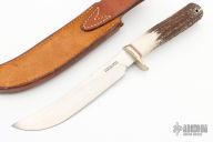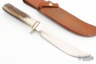 This Model 4-7 Big Game Skinner by Randall Made Knives has a satin finished blade with .203" blade stock and 1.130" blade depth, hidden tang construction. The handle has nickel silver guard, stag grip with lanyard hole, red/white/blue spacers. Comes with a brown leather sheath. Has a few light scratches, otherwise excellent condition.