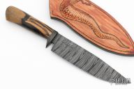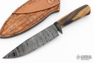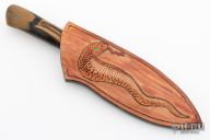 This bowie by Abril Knives features a Damascus blade with .145" blade stock and 1.748" blade depth, hidden tang construction. The handle has a carbon fiber guard, and stabilized ebony grip. Comes with hand-tooled leather sheath. Excellent work. New from maker!