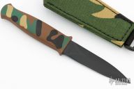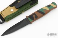 This Loveless-style Gerber Guardian Boot Knife has a double edged black blade with camo aluminum handle, .137" blade stock and .809" blade depth, hidden tang construction. S/N G67781S. Excellent condition. Comes with camo nylon sheath with boot clip. Includes the original box and papers.  Excellent condition.