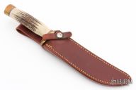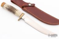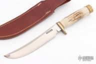 This Model 4-7 Big Game Skinner by Randall Made Knives has a satin finished blade with .208" blade stock and 1.168" blade depth, hidden tang construction. The handle has brass guard, stag grip and a brass butt, red/white/blue spacers. Comes with a brown leather sheath. Has a few light scratches, otherwise excellent condition.
