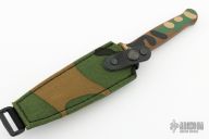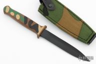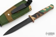 This Loveless-style Gerber Guardian Boot Knife has a double edged black blade with camo aluminum handle, .188" blade stock and .771" blade depth, hidden tang construction. S/N C1628S. Excellent condition. Comes with camo nylon sheath with boot clip. Includes the original box and papers.  Excellent condition.