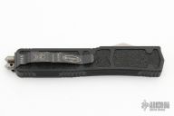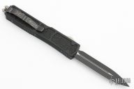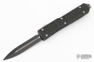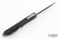 This Makora OTF automatic by Microtech features a black double edge blade. The handle has a black aluminum frame with nonslip inlays. Black stainless steel clip, tip down carry. Dated 01/2005 and 2315 on clip. Includes the original box papers and nylon sheath.  Light scuffs are visible on the pocket clip otherwise the knife is in excellent condition.