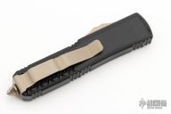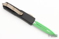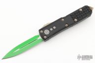 This UTX-85 OTF Automatic from Microtech features a green cerakoted double-edged blade with fuller. The handle has a black aluminum tri grip frame with bronzed steel thumb slide, clip and glass breaker. Dated 04/2016 with a S/N of 00069. Excellent condition. Comes with original box and papers.