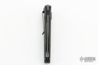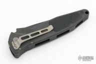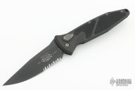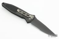 This Socom Elite Auto by Microtech has a black coated partially serrated blade. Stainless steel clip. Black aluminum frame with rubber inserts. Dated 01/2001, #2337. Includes original packaging, sheath, and papers. Excellent+ condition.