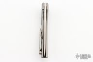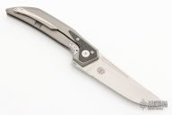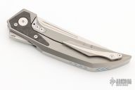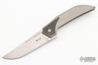 This Future model has a hand rub satin finished blade and a titanium handle with a titanium clip and carbon fiber inlays. The Future represents the first ever integral folding knife from Reate Knives. This Bharucha designed flipper offers a 1 piece titanium handle for extreme strength and reliability. The Future is a massive folder with a 4.25" M390 blade, yet it remains slim and sleek for comfortable EDC. A titanium pocket clip and carbon fiber inlays finish off the collectible design. Features: Integral handle made from a solid billet of titanium provides strength and durability. Bearing pivot disassembles easily for cleaning and maintaining the knife. M390 blade offers extreme sharpness and edge retention. Comes with original box and zippered case. Excellent condition.