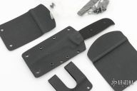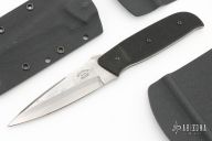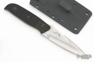 This Cave Cub has a Meier Steel San Mai Damascus blade with a false top edge and notched thumbrest, .114" blade stock and 1.010" blade depth, full tang construction. The handle has textured black G-10 scales. #6142. Includes kydex sheath with removable belt clip and all the extra attachments and hardware. Excellent condition.