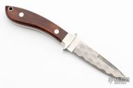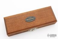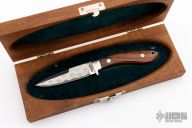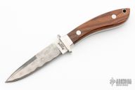 This Fixed Blade by Browning features a San Mai Damascus spear point blade with swedge, .184" blade stock and .783." blade depth. The handle is comprised of a steel guard and wood scales over full tang construction. Lanyard tube in pommel. Includes wooden presentation box and papers. Numbered 0397on guard. Has some light scratches, otherwise excellent condition.