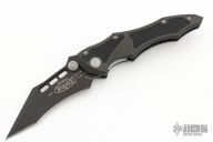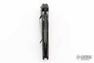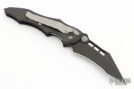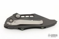 This Vector manual folder from Microtech features a black blade with dual thumb studs and notched thumb ramp. The handle is comprised of black anodized aluminum frame with non slip inserts over green barrel spacers. Stainless steel inlaid lockbar. Stainless Steel tip down clip. Dated 12/99 and #0577. Comes with original box, papers, and nylon sheath. Excellent condition.