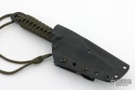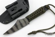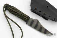 This knife by Strider features a tiger striped blade, .259" blade stock and 1.315" blade depth, full tang construction. The handle has green paracord wrap. Comes with a kydex sheath. Excellent condition.