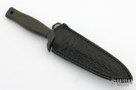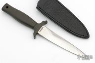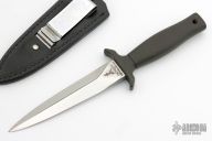 This Mark 1 dagger by Gerber is double-edged and high satin finished, .235" blade stock and .950" blade depth, hidden tang construction. Black coated aluminum handle. Comes with black leather sheath with boot clip. #010966. Excellent condition.