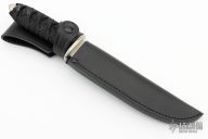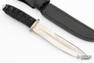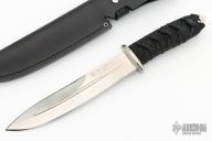This Boker Plus Collection 2005 Knife features a satin finished blade with sharpened top edge, .195" blade stock and 1.280" blade depth, hidden tang construction. The handle has a stainless steel guard and black cord wrap over black textured underlays. Comes with a black leather sheath, original box and papers. #099 on the blade, only 1999 made. Has a couple small oxidation spots, otherwise excellent condition. Pohl design.