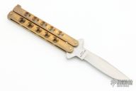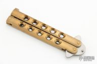 This balisong by Frost Cutlery features a satin finished blade. The handles are brass channel construction. Has a brass T-latch. Has some scratches, but otherwise good condition for its age!