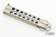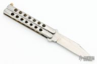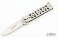 This is an original vintage butterfly knife, made by Tak Fukuta circa 1980s in Seki, Japan for Dragon-Lock. It features a stainless steel blade, stainless handle with brass channel construction liners and a brass t-latch. Has some scratches and dings, otherwise good condition for its age.